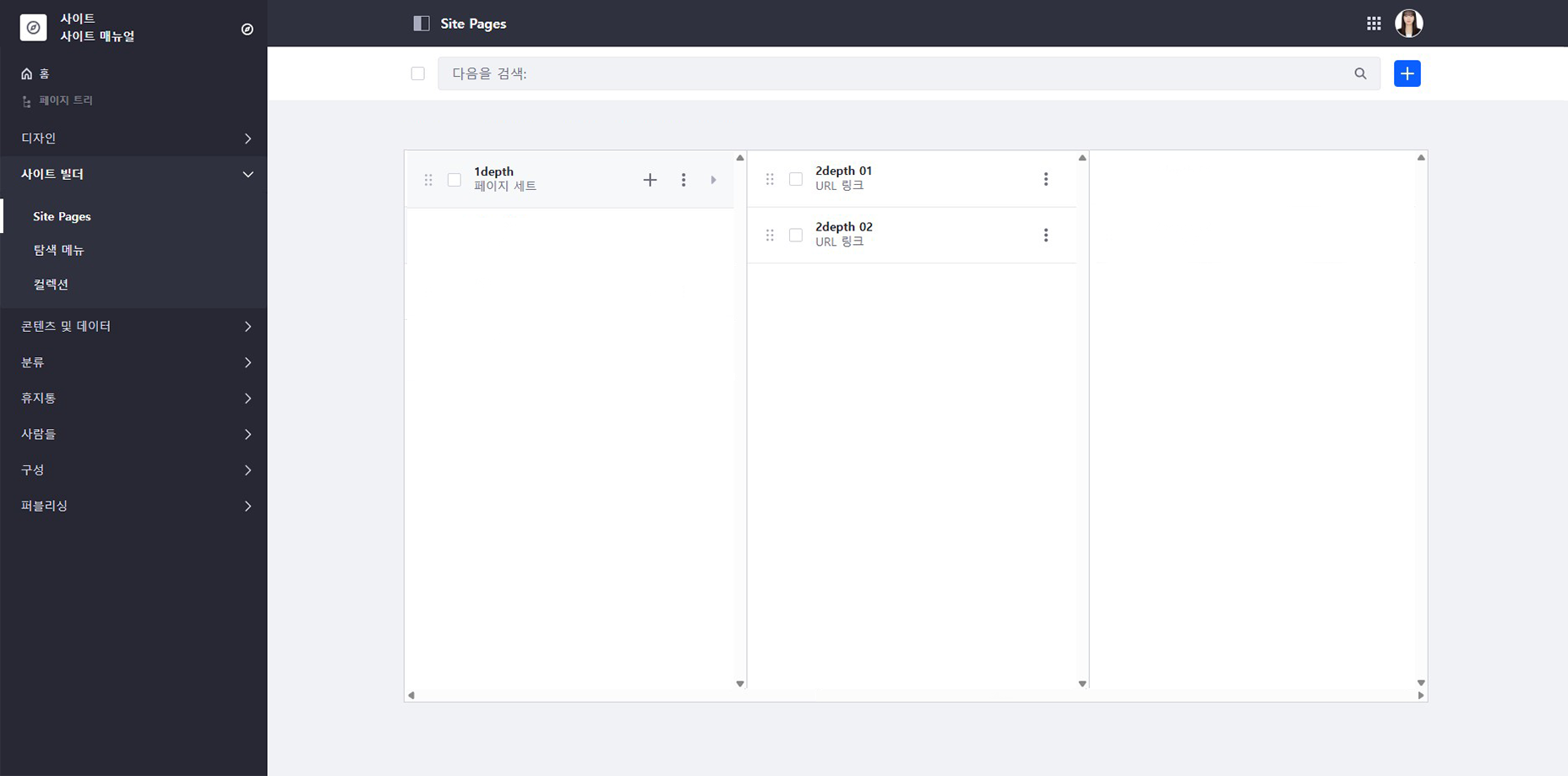 ① 좌측 상단 메뉴를 통해 Site pages에 접속합니다.