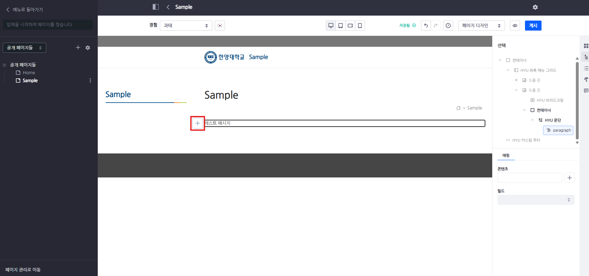 ① 프래그먼트가 삽입된 영역에서 콘텐츠를 추가할 위치를 클릭하면 좌측에 플러스(+) 버튼 도구 모음이 생성됩니다.