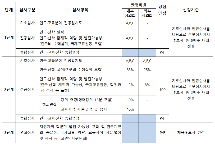 ※ 1단계 기초심사, 전공심사 및 2단계 기초심사의 개인별 심사는 A, B, C로 평가, 종합심사에서 2단계 및 3단계 심사대상자 여부를 정함